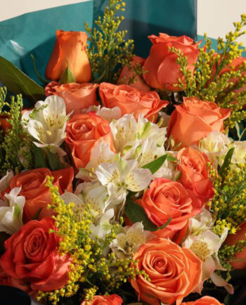 elevate your gifting with a fragrant lootah perfume and a bouquet of peach and white roses, waxflowers, and eustomas. wrapped in dark teal and white, this luxurious arrangement paired with an enchanting unisex scent is a refined way to express appreciation.